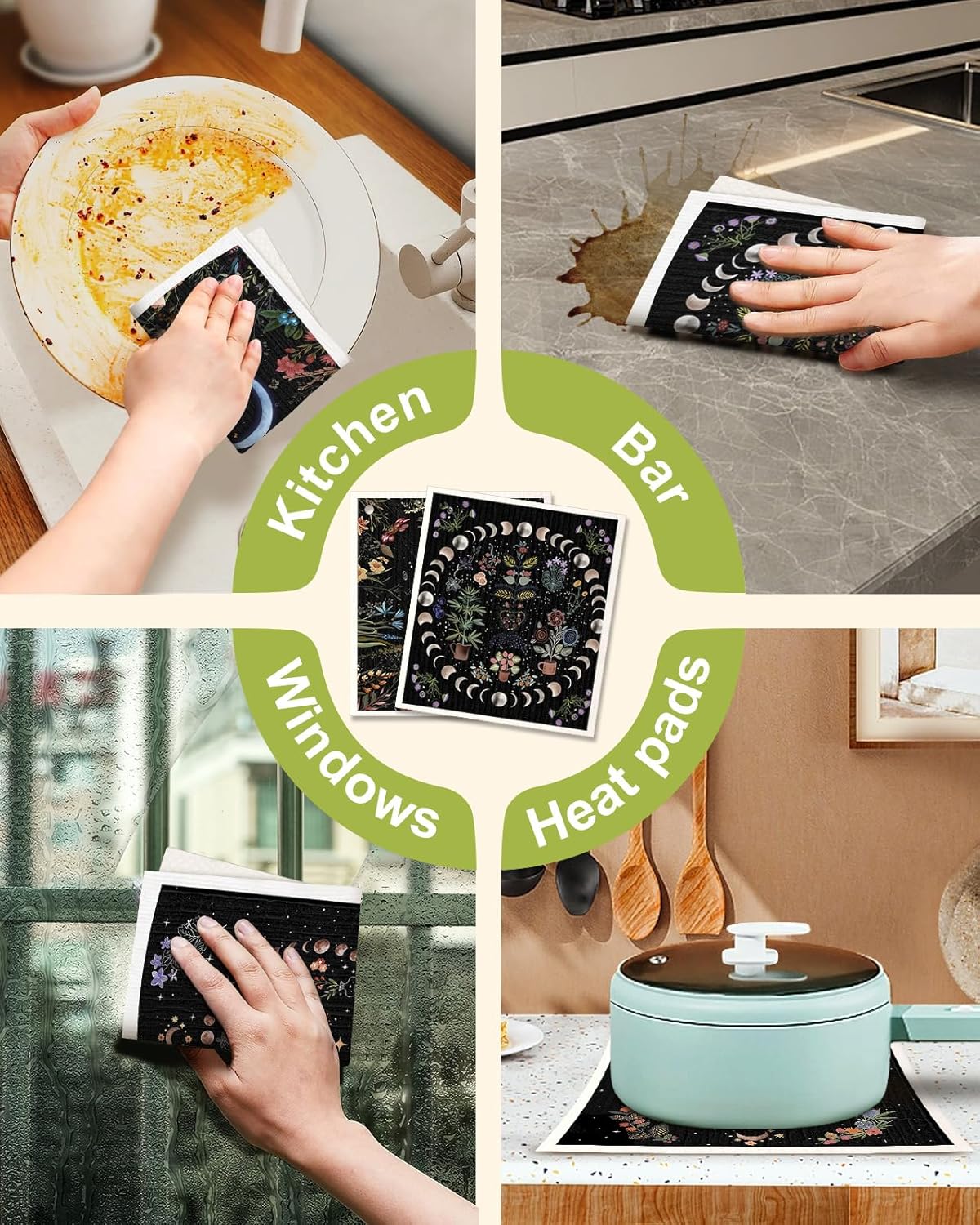 • REUSABLE: Our reusable swedish dish Cloths made of 30% cotton and 70% cellulose, fast drying and super absorbent, multiple cleaning projects around the kitchen and house