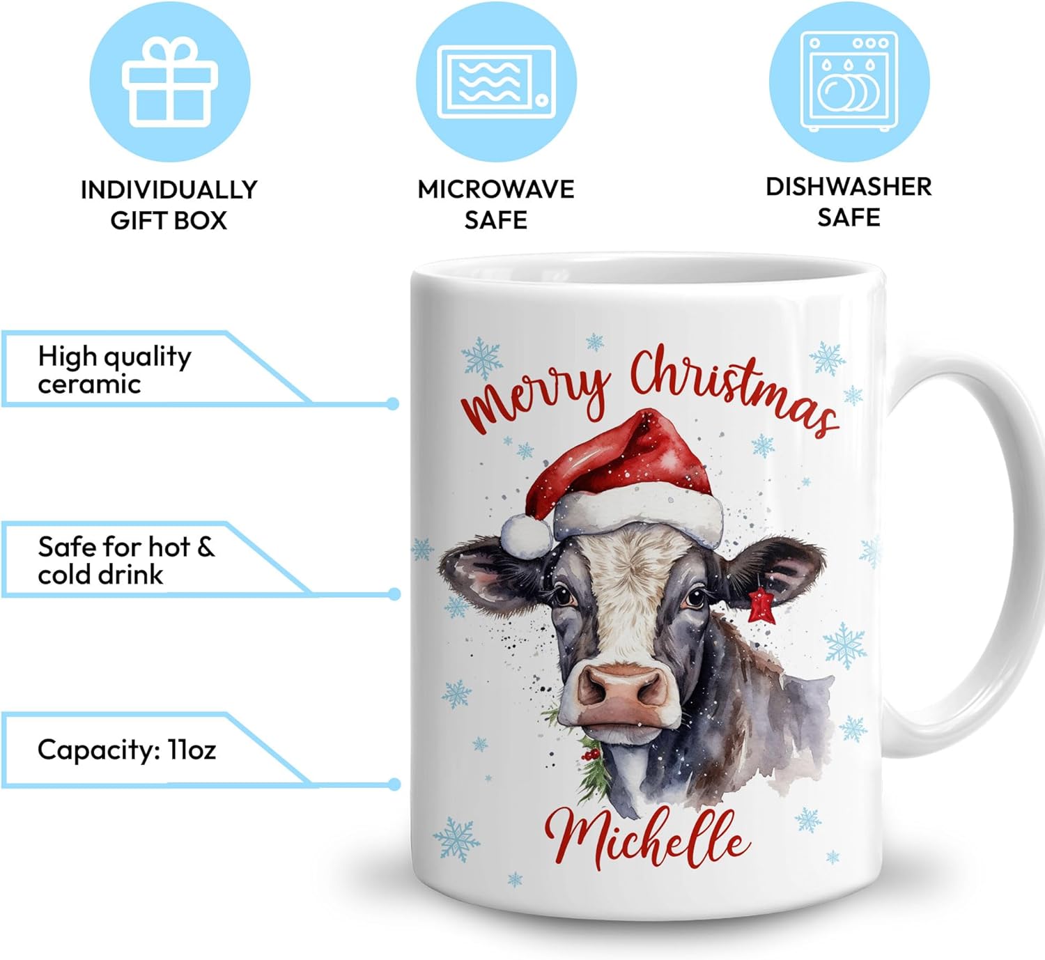 Hyturtle Personalized Gifts Cow Lover - Cow Wearing Santa Hat Custom Name Ceramic Coffee Mug Cup 11oz - Cute Animal Lovers Gifts For Women, Girl kids Family On Birthday, Christmas