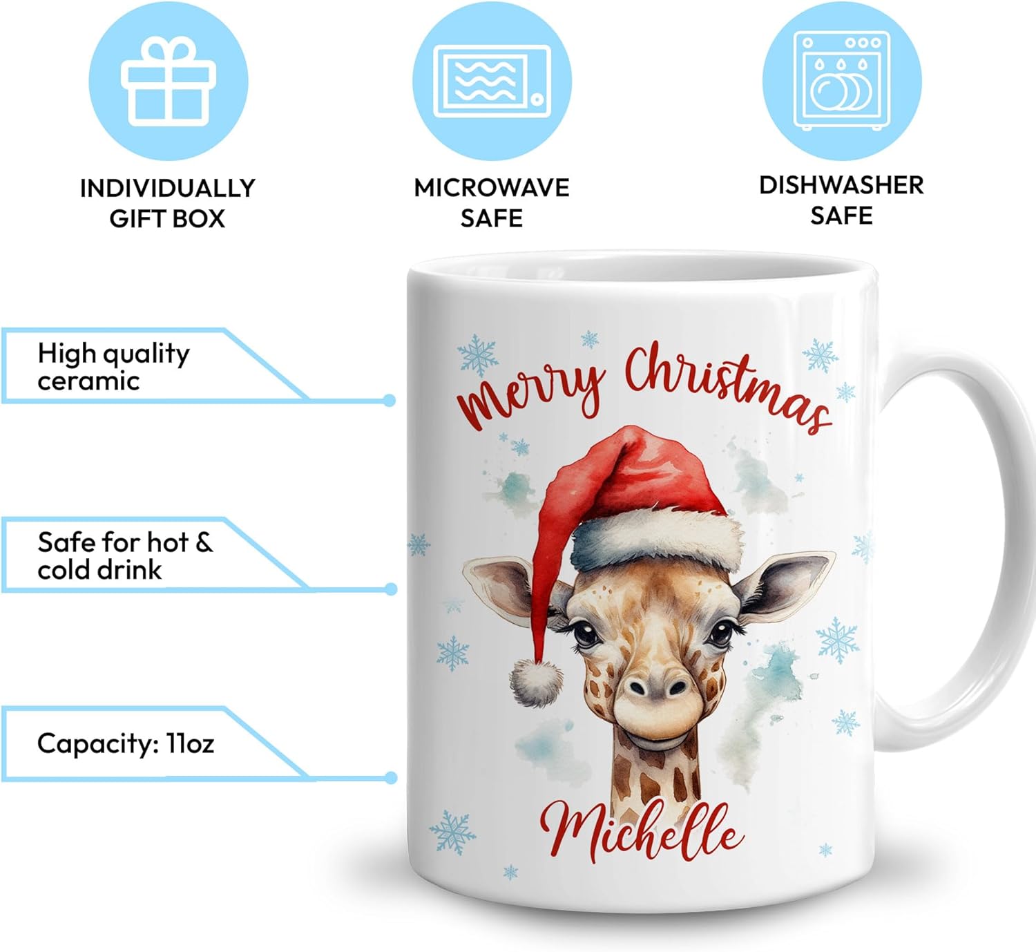 Hyturtle Personalized Gifts Giraffe Lover - Giraffe Wearing Santa Hat Custom Name Ceramic Coffee Mug Cup 11oz - Cute Animal Lovers Gifts For Women, Girl kids Family On Birthday, Christmas