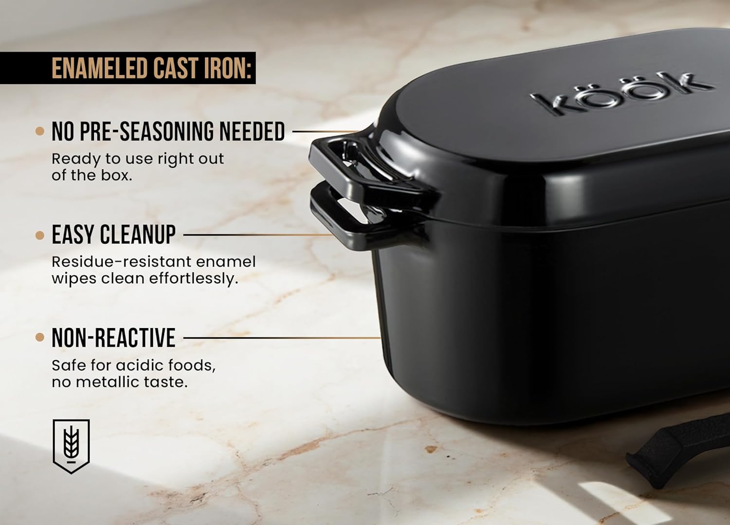 KooK Dutch Oven, for Bread Baking, Sourdough Loaf Pan, with Lid, Dual Handles, Enameled Cast Iron, includes Lid Lever, Dishwasher Safe, 3.4 Qt, Black
