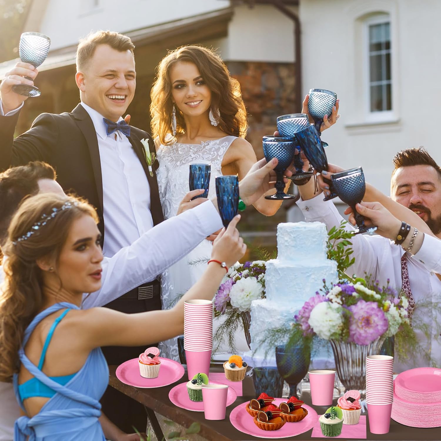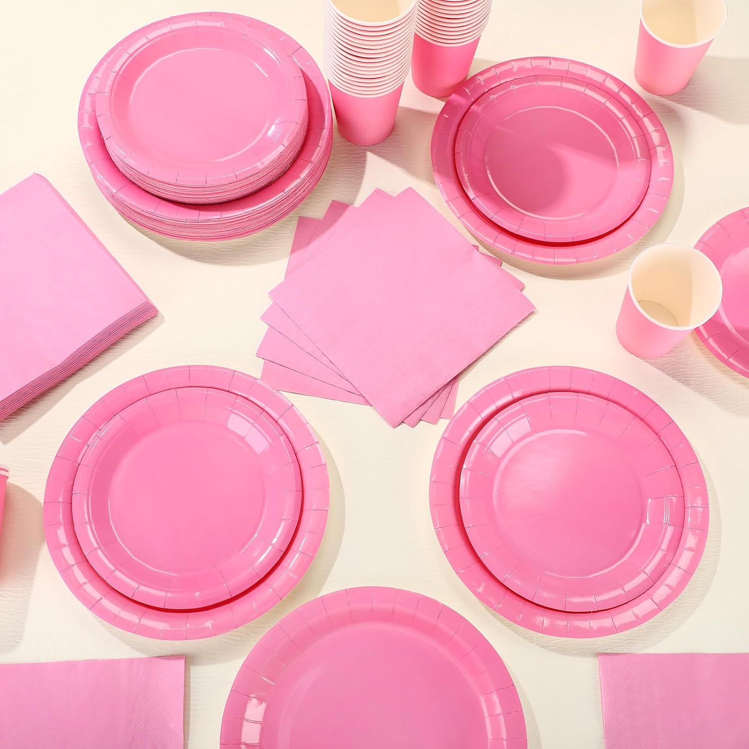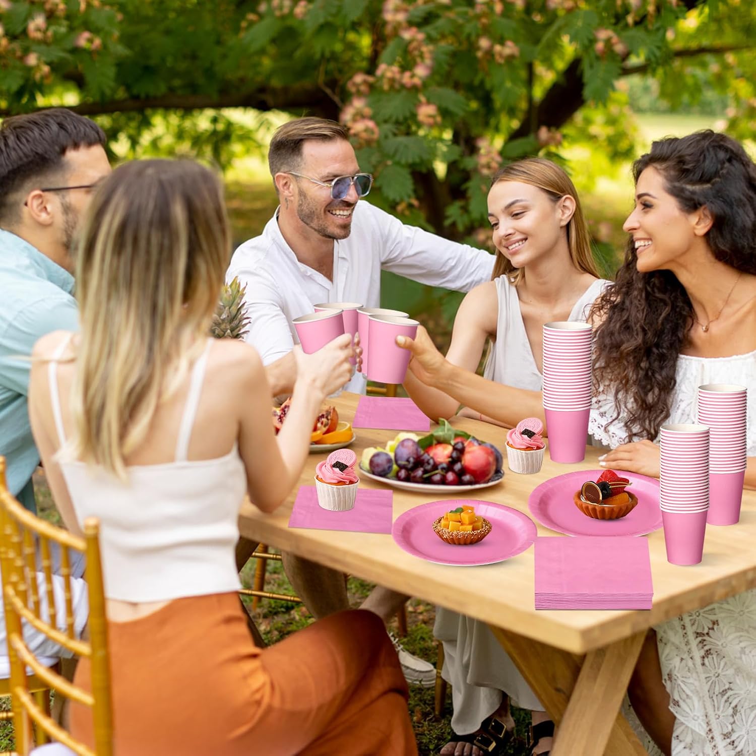 Tioncy 200 Pcs Disposable Paper Plates Cups and Napkins Party Supplies Serve 50 Guests Disposable Paper Dinnerware Set for Halloween Birthday Wedding Baby Shower Family Picnic(Pink)