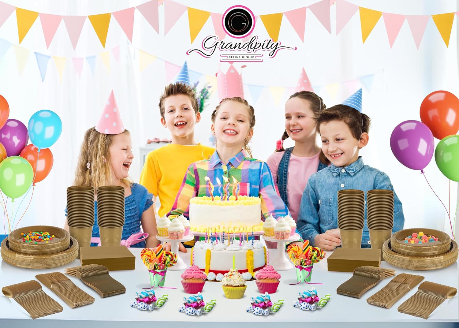 Grandipity 350 Piece Gold Disposable Dinnerware Set, Includes 50 of Each: 9" Dinner Plates, 7" Dessert Plates, 12oz Cups, Paper Napkins, Forks, Knives & Spoons