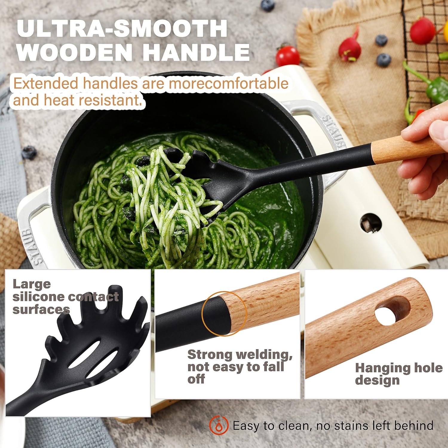 • EASY TO CLEAN: Our cooking utensils set is made of food-grade silicone. The silicone smoothly connects to the wooden handles without gaps, making cleaning easy. Because of the wooden handles, we suggest not putting them in the dishwasher or soaking them in water for too long