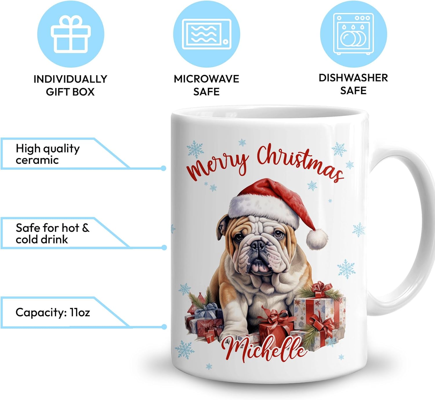 Hyturtle Personalized Gifts Dog Lover - Bulldog Merry Christmas Custom Name Ceramic Coffee Mug Cup 11oz - Cute Animal Lovers Gifts For Women, Girl kids Family On Birthday, Christmas
