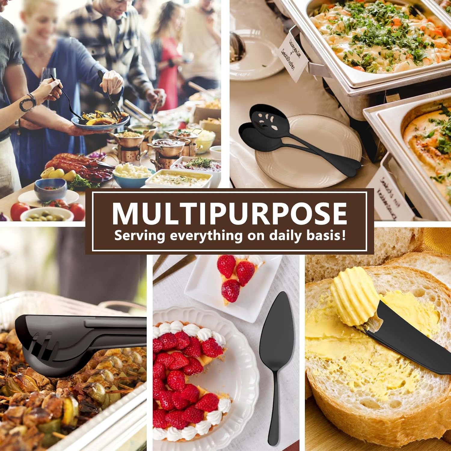 • 【Nice Buffet Serving Set】These metal black serving utensils will be very suitable for serving food, distributing solid food, picking up food, filtering food, spreading butter and jam. The classic and elegant design makes this serving utensil set perfect for most dining occasions, providing you with a cozy and enjoyable dining atmosphere