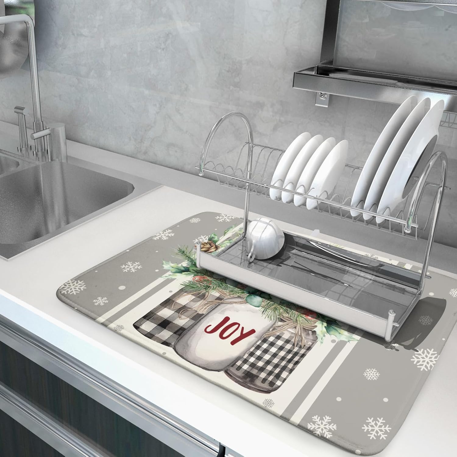 • 【WILD USAGE】-- This Christmas dish rack mat captures drips from under the dish rack.you can also place pots, pans, dishes, cups and bottles directly on the mat. As a kitchen counter mat, it Protects countertops and tables from hot pots and pans while protecting other appliances.