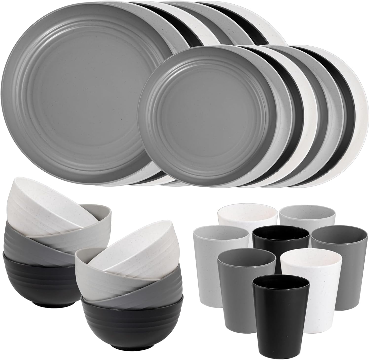• SAFE MATERIAL:The wheat straw dinnerware set is made of natural straw fiber & food grade safe materials. Its 100% BPA free, non-toxic. Sturdy and durable, Dark four color plastic dinnerware set is very strong, durable, lightweight and unbreakable, will not break or chip like porcelain or ceramic, even if they are dropped or hit by accident!