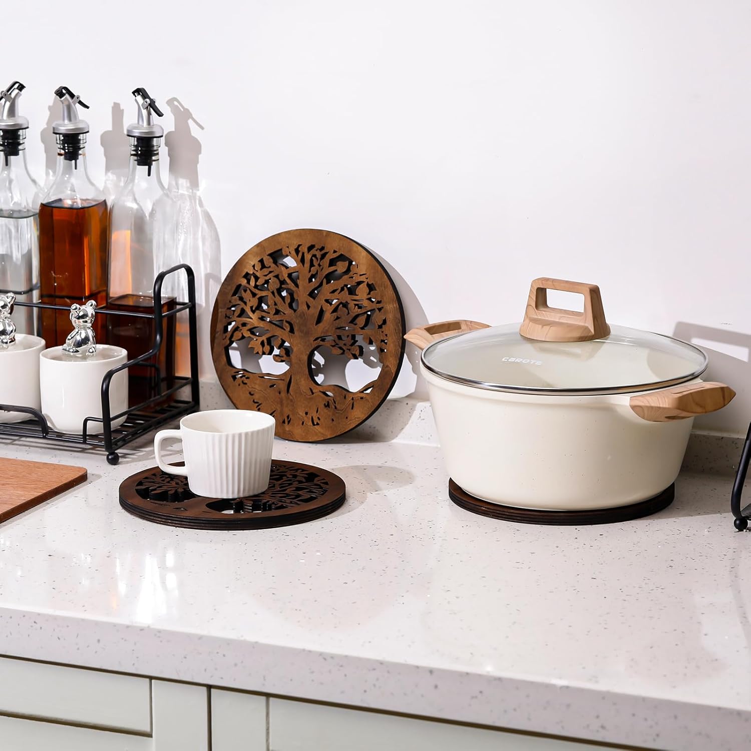 • Decorative Function: our wood trivets for hot pans go beyond just functionality, they also act as an eye catching decorative piece when not in use; The brown color complements different table settings, making these trivets an exquisite addition to your kitchen or dining room