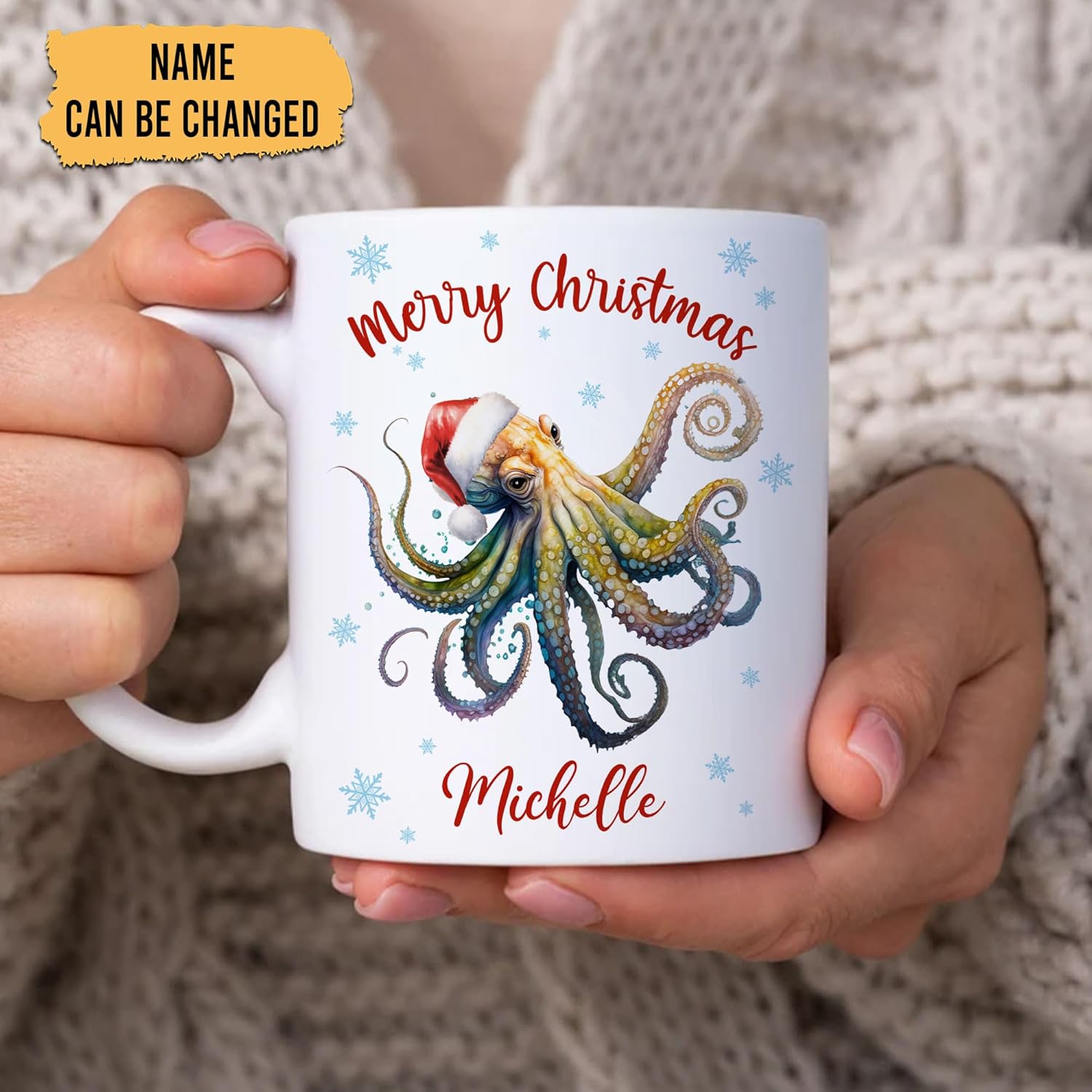 Hyturtle Personalized Gifts Octopuses Lover - Merry Christmas Customized Name Ceramic Coffee Mug Cup 11oz - Cute Sea Animal Lovers Gifts For Women, Girl kids Family On Birthday, Christmas