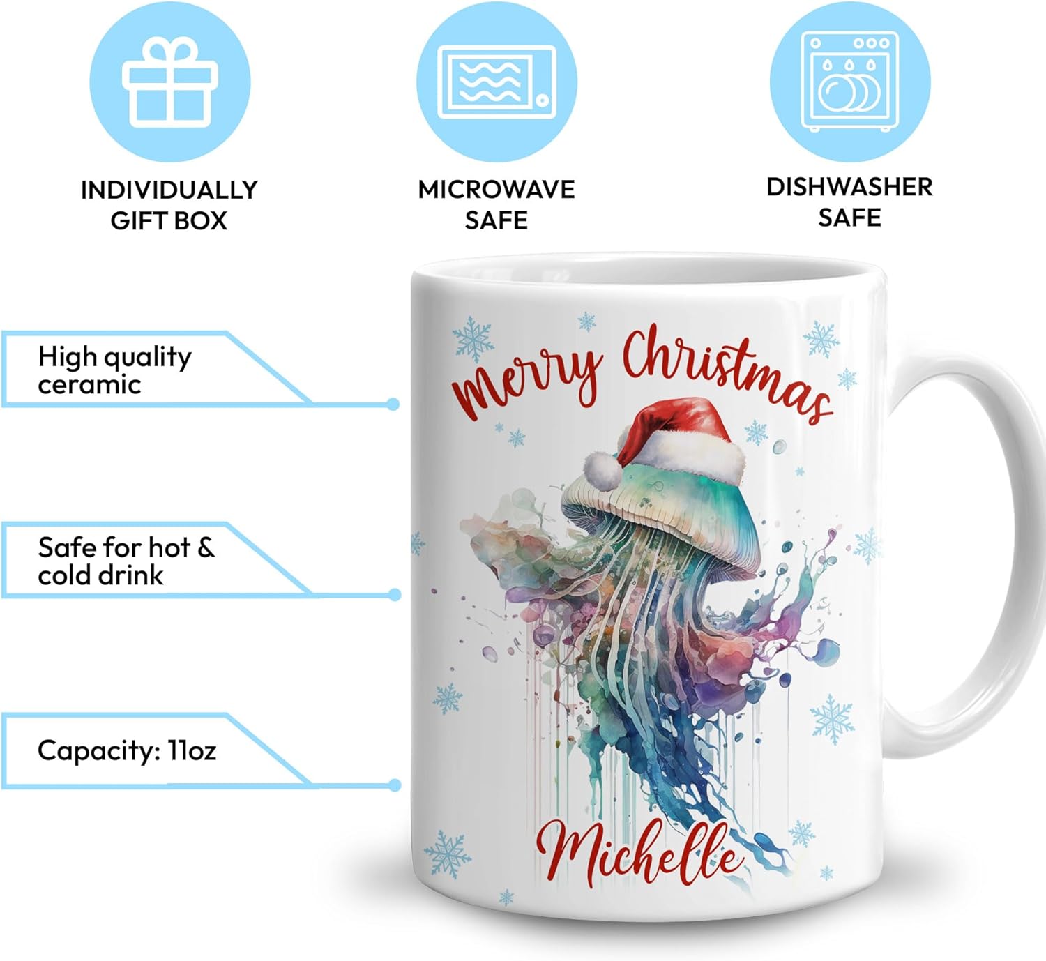 Hyturtle Personalized Gifts Jellyfish Lover - Merry Christmas Customized Name Ceramic Coffee Mug Cup 11oz - Cute Sea Animal Lovers Gifts For Women, Girl kids Family On Birthday, Christmas