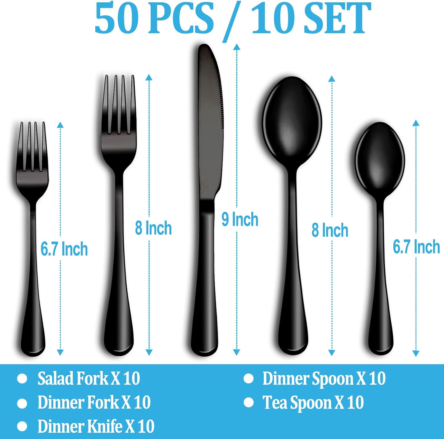 • 50 PIECES BLACK SILVERWARE SET FOR 10: This black silverware set comes with 10 Dinner Forks, 10 Dinner Spoons, 10 Dinner Knife, 10 Salad/Dessert Fork and 10 Dessert/Tea Spoons, essential for families or restaurants. The set is also an irreplaceable dining tool whether it is for daily use or for preparing dinners or parties.