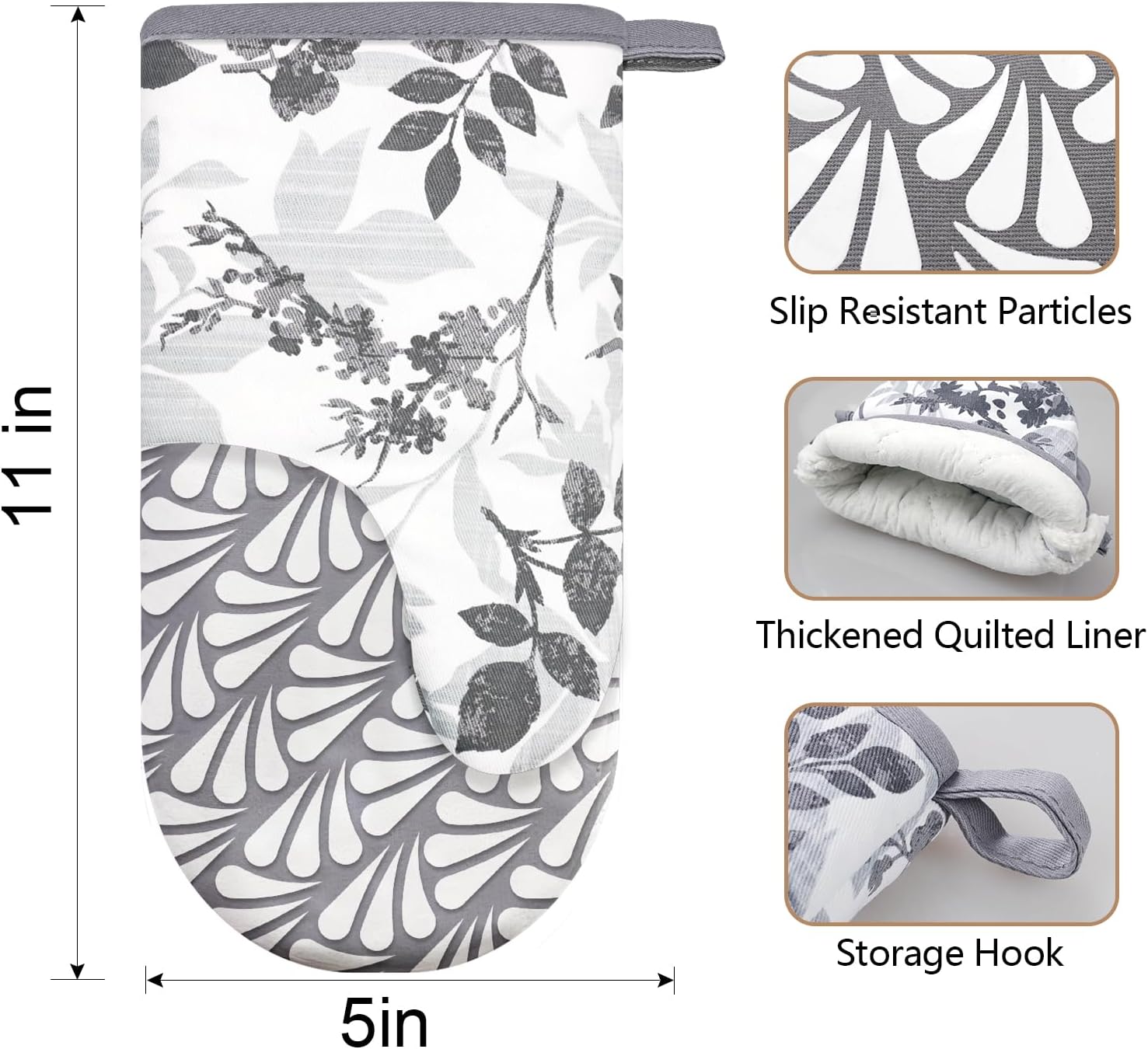 Thumb Oven Mitts, Heat and Slip Resistant Silicone Kitchen Mittens 2-Pack Set, Foliage Textured Flower Soft Long Oven Gloves, Flexible Thick Potholders for Safe Baking Cooking and Gr (Grayish)