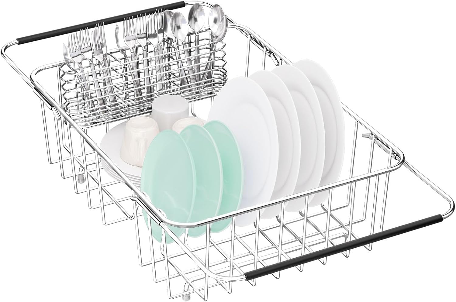 Large Dish Drainer Rack in Sink Adjustable, Expandable 304 Stainless Steel Metal Dish Drying Rack Organizer with Stainless Steel Utensil Holder Over Inside Sink Counter, Rustproof