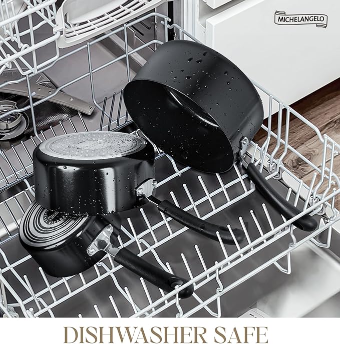 • [FAST & EVEN HEATING] - The nonstick pot in our set has durable aluminum alloy base that greatly enhance heating performance. The sauce pans are suitable for all stovetops. Dishwasher safe.
