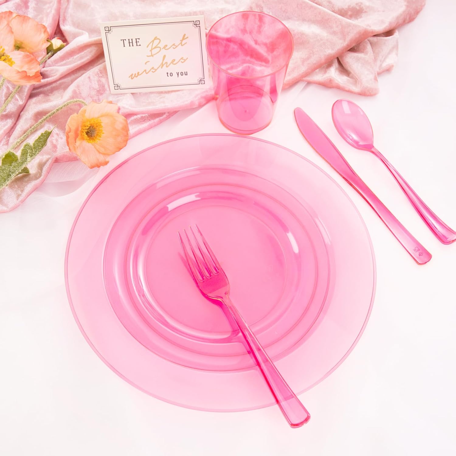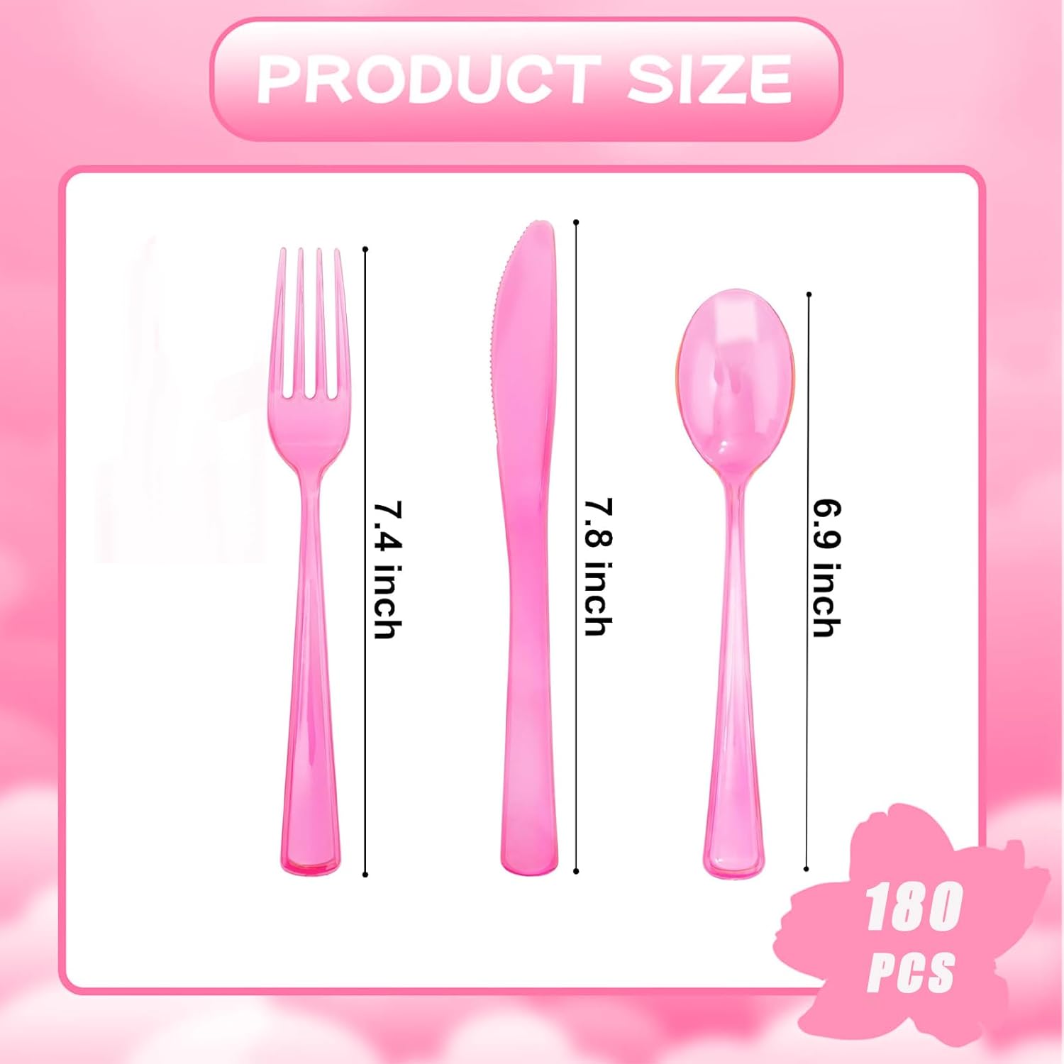 WDF 180 Pieces Pink Plastic Silverware Disposable - Clear Pink Cutlery Sets 60 Forks, 60 Knives and 60 Spoons - Heavy Duty Disposable Utensils for Wedding, Party