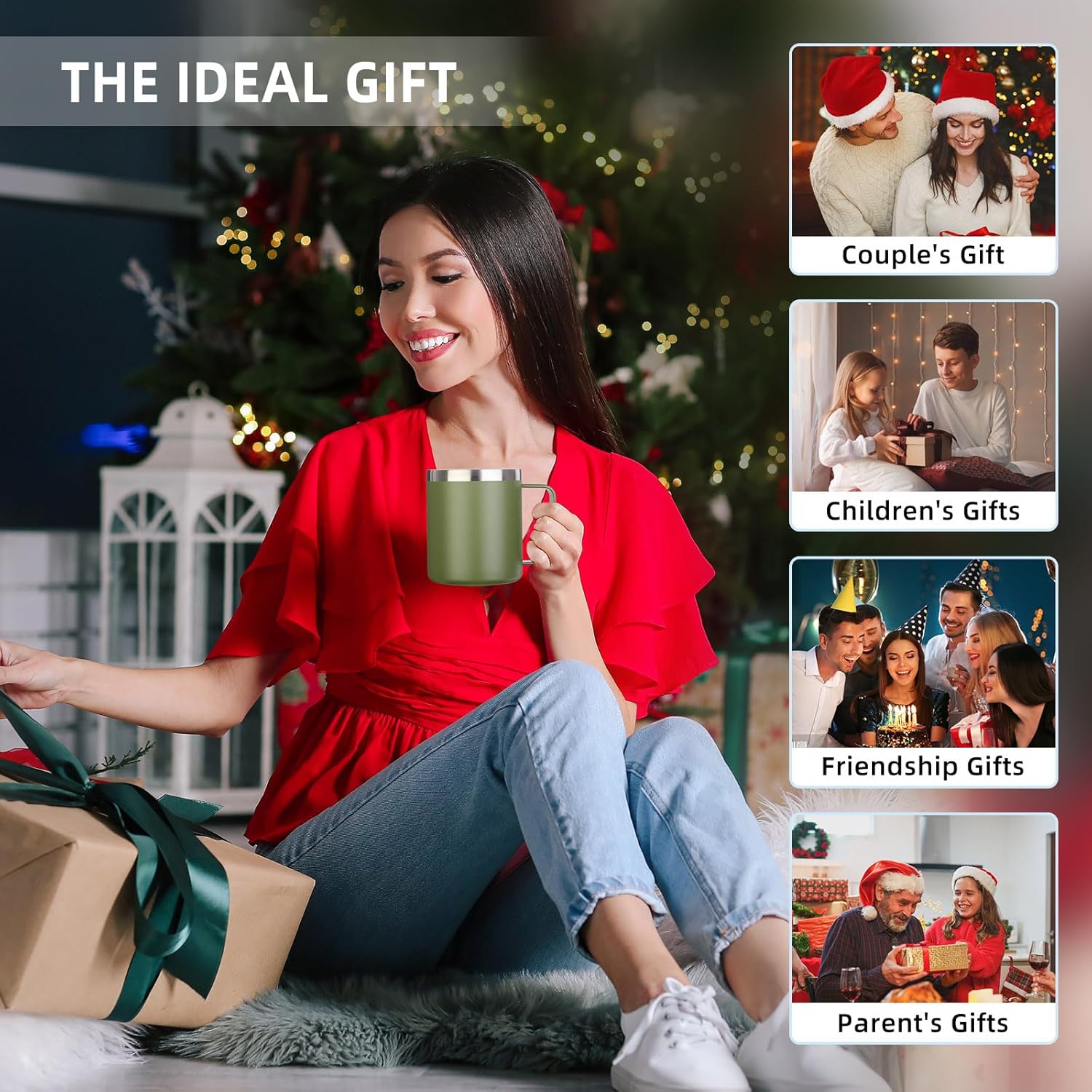 Volhoply 14oz Insulated Stainless Steel Coffee Mug with Lid Bulk 2 Pack,Double Wall Vacuum Travel Coffee Cup with Handle,Reusable Cups Tumbler,Camping Mugs Keep Hot,Ideal Gifts(Army Green,2)