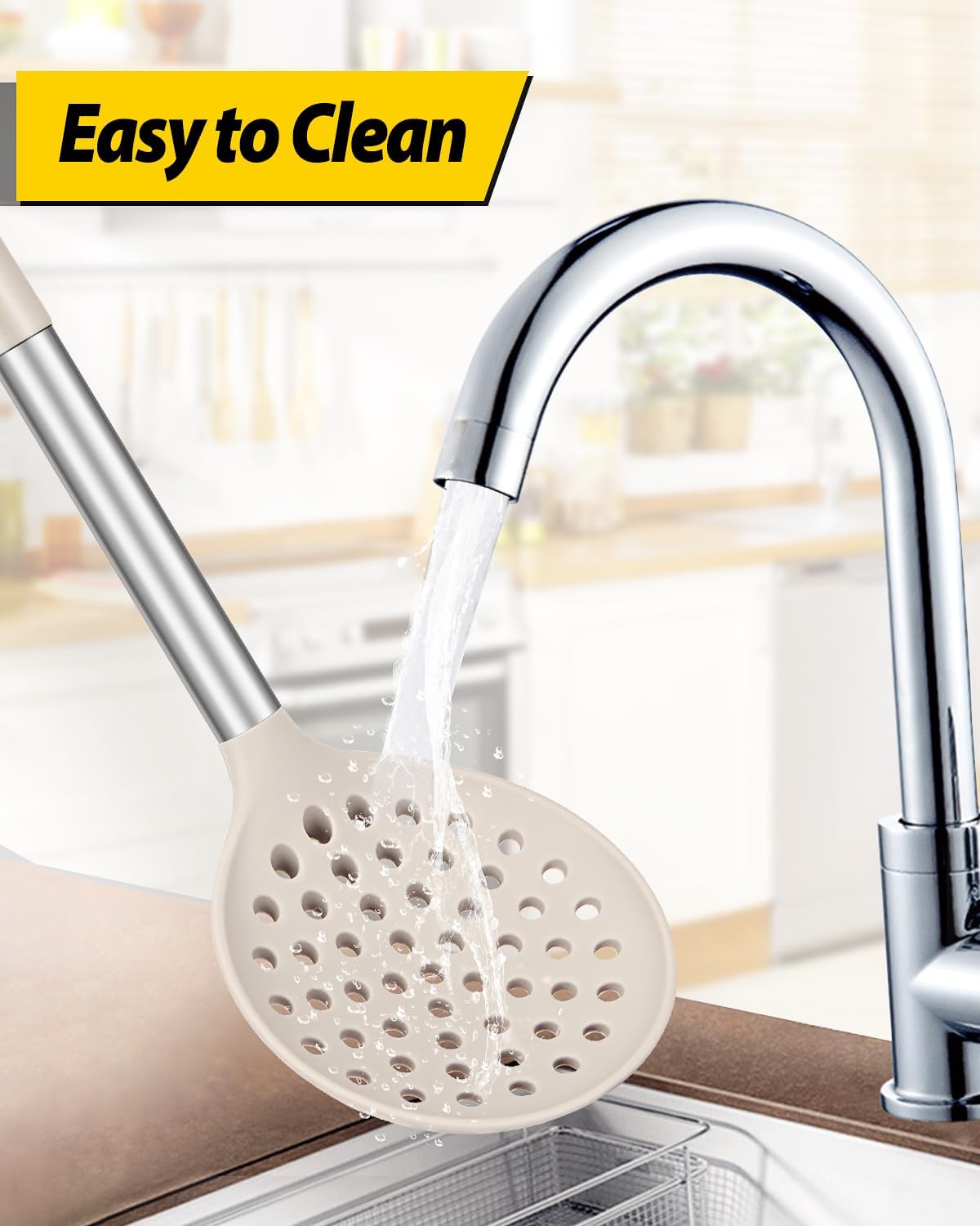 • More Safe and Healthy : Our kitchen ladle strainers are made of food-grade silicone, free of BPA;Even at high temperatures, there is no need to worry about melting or deforming;And the soft silicone head won't scratch the coating, it can better protect your pot