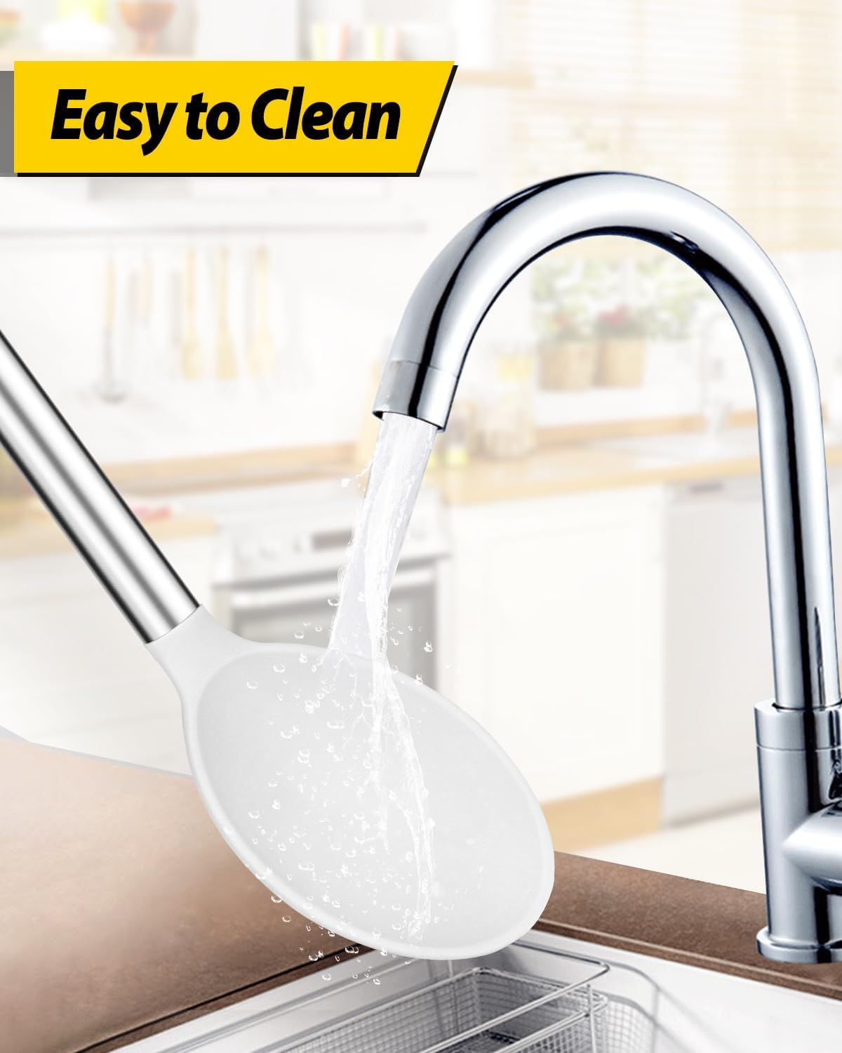 • Thoughtful Design : The good-quality 18/8 stainless steel keeps you away from the trouble of kitchen utensils rusting or breaking; This anti-scald silicone handle is not easy to conduct heat and is more comfortable to hold than traditional utensils