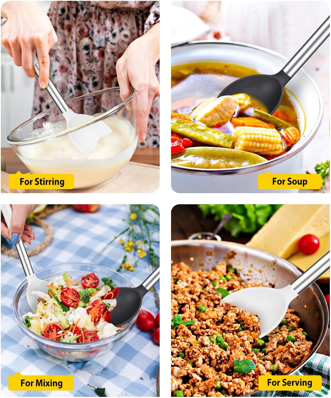 Pack of 2 Large Silicone Cooking Spoon Non Stick Solid Basting Spoons Heat-Resistant Kitchen Utensils for Mixing Serving (Black-White)