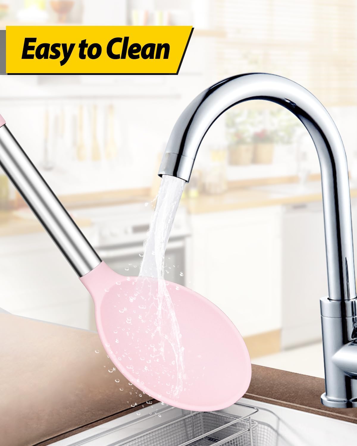 • More Safe and Healthy : Our silicone spoons are made of food-grade silicone, free of BPA;Even at high temperatures, there is no need to worry about melting or deforming;And the soft silicone head won't scratch the coating, it can better protect your pot