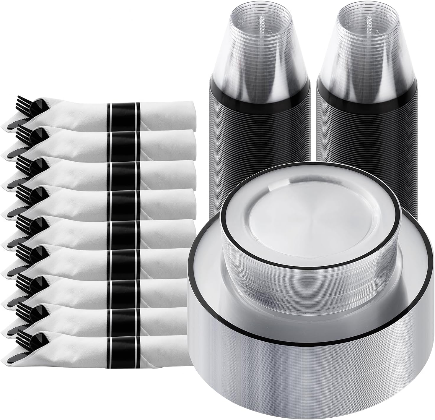 • ELEGANT DESIGN - Elevate your parties with these disposable dinnerware sets featuring a delicate black trim decorative pattern. They add an element of elegance and luxury to your gatherings with their premium quality. Disposable plates and cutlery can be tossed in the trash without the need for cleaning after use, saving time.