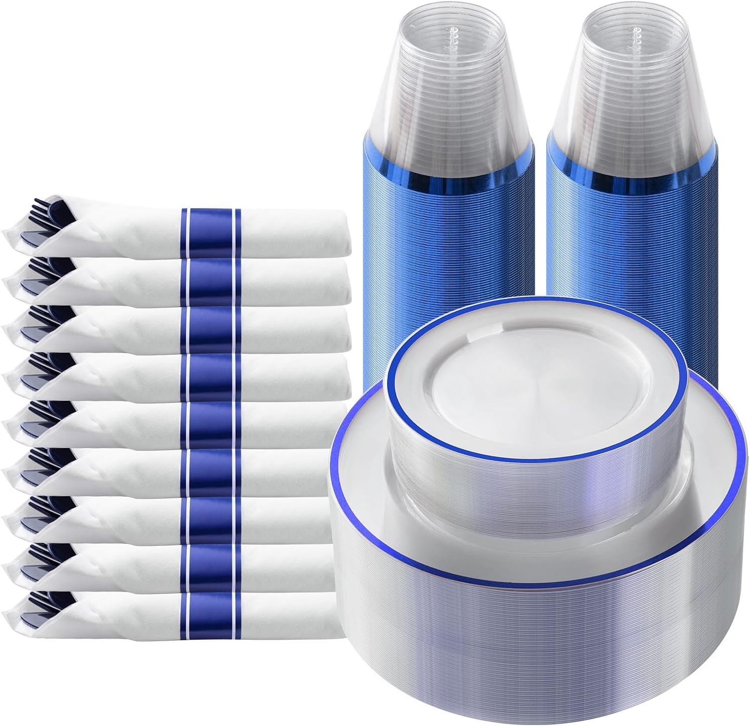 • ELEGANT DESIGN - Elevate your parties with these disposable dinnerware sets featuring a delicate dark blue trim decorative pattern. They add an element of elegance and luxury to your gatherings with their premium quality. Disposable plates and cutlery can be tossed in the trash without the need for cleaning after use, saving time.