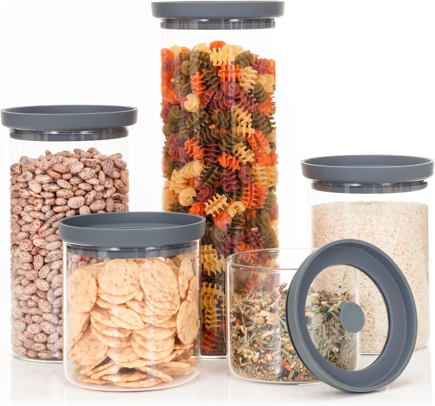 • Sophisticated Pantry Organizers: Each crystal-clear glass container in this 5-pack set (54oz +37oz+28oz+22OZ+17.5oz) and has a sealed lid in chic gray silicone for pretty and practical kitchen organizing