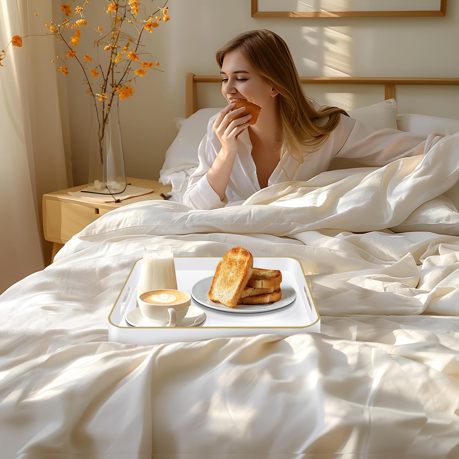 • TRAY DECOR: White tray is often used to present food and drinks in an appealing and organized manner. Square table tray can enhance the visual appeal of the items being served, making them more enticing to guests or customers. Also place it on your bathroom vanity as an exquisite showcase for perfumes, jewelry, or bath accessories.