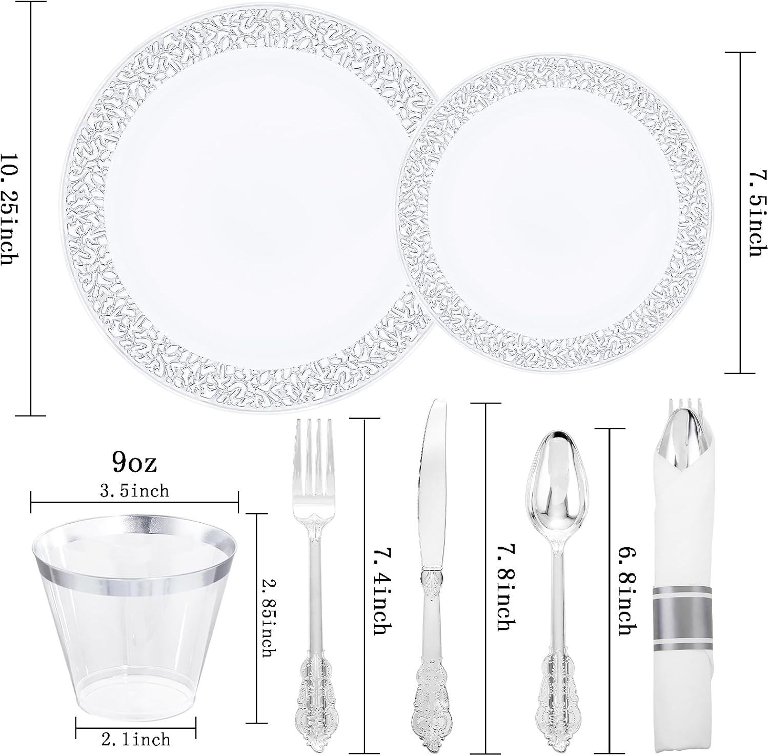 • SERVE FOR 30 GUESTS: This 210 pieces silver disposable dinnerware set includes 30 silver plastic dinner plates 10.25”, 30 plastic appetizer plates 7.5”, 30 silver plastic glasses 9 oz, 30 pre rolled napkins , 30 forks, 30 spoons, 30 knives.