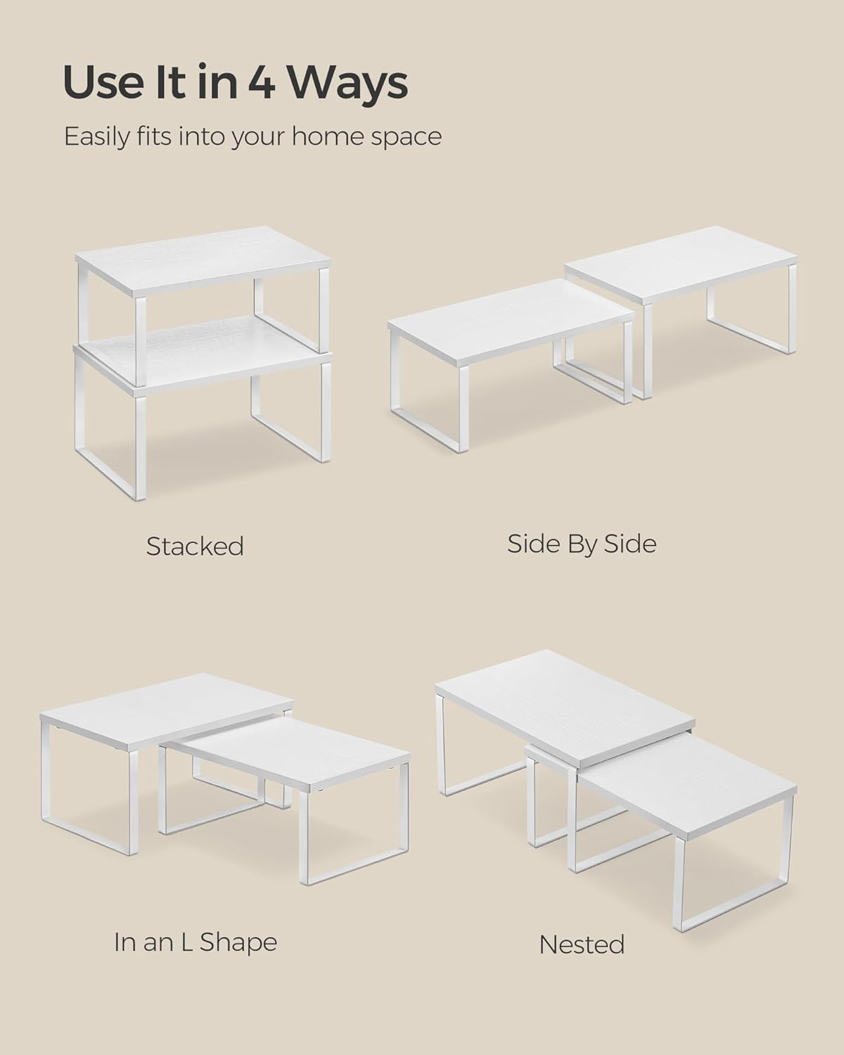 • [Adjustable] With their unique design, with one slightly smaller than the other, these shelf organizers can be stacked on top of one another, nested, used separately, or even in an L-shape. Adjust them how you want to perfectly fit your kitchen space