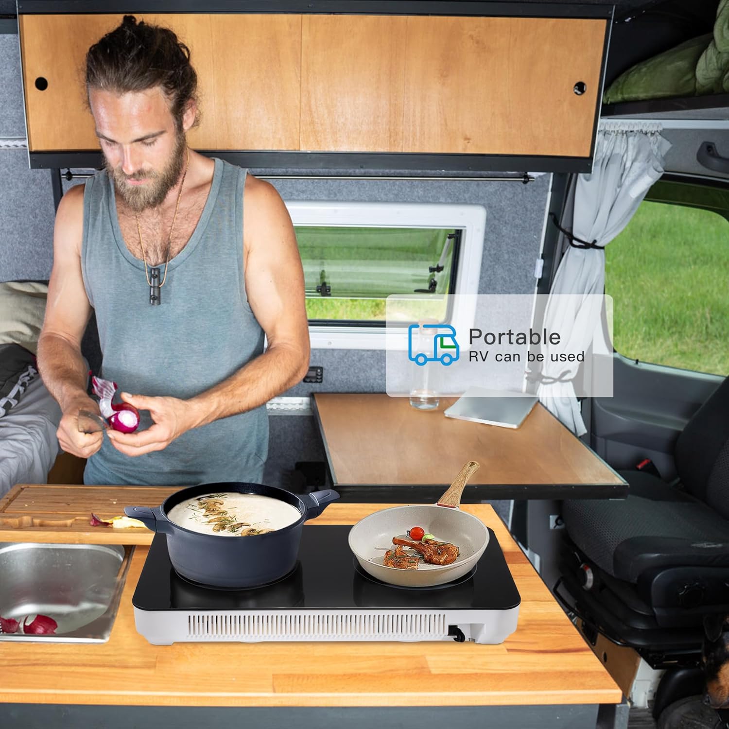• Efficient Dual Cooking Zones: Explore the culinary versatility of our 1800W induction cooktop, boasting two independent cooking zones. Seamlessly multitask in the kitchen by boiling water on one side while gently simmering a sauce on the other. With 10 temperature settings per zone, ranging from a gentle simmer to a rapid boil, you can achieve the perfect heat level for every dish with ease.
