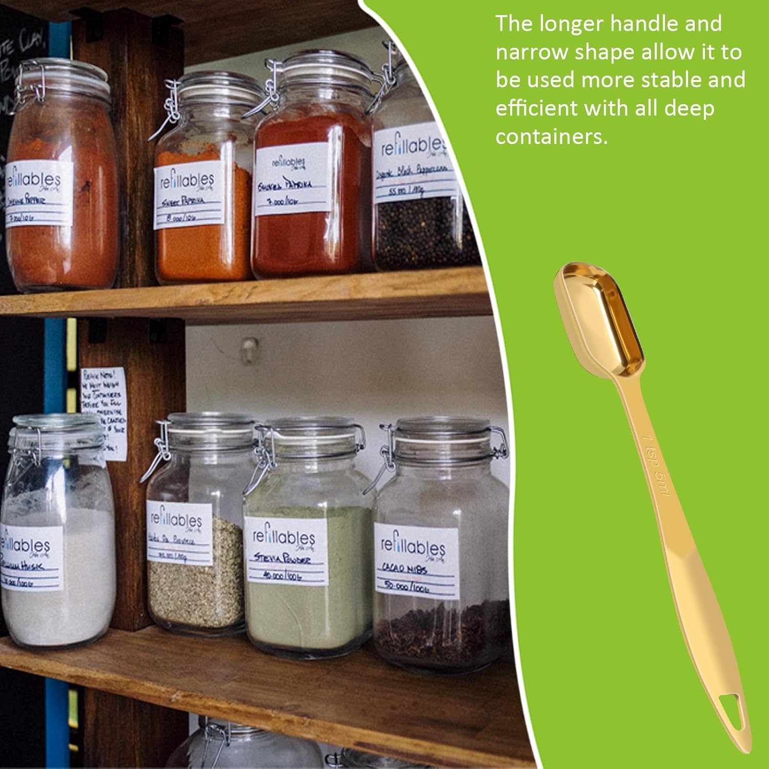 • 【High Quality】Unlike ordinary measuring spoons, the durability measuring spoon is 100% made from food-grade 304 stainless steel with rectangular & narrow design to ensure that the spices will not be spilled. The longer handle and narrow shape allow it to be used more stable and efficient with all deep or shallow spice jars, bottles, and containers.