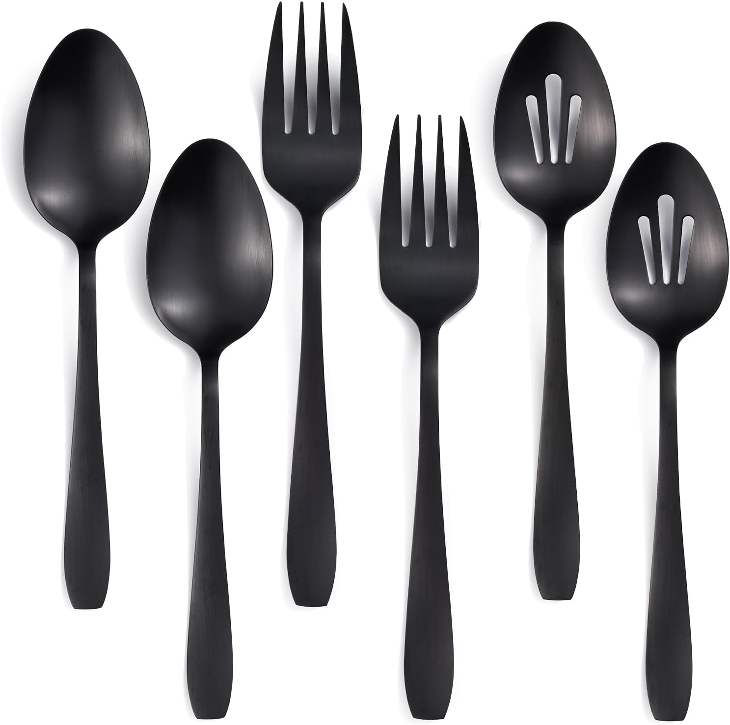 6 Pieces Large Black Serving Utensils, Stainless Steel Catering Buffet Serving Set Hostess Set, Serving Spoon x 2, Slotted Serving Spoon x 2 and Serving Forks x 2 for Party Banquet Cooking