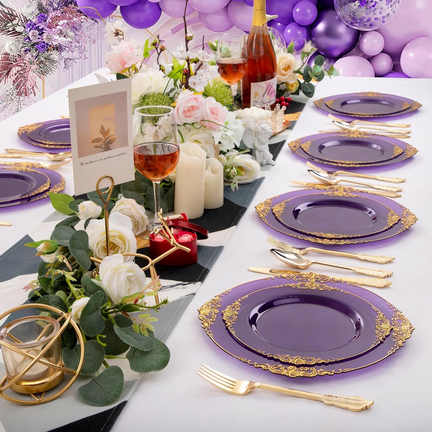 102PCS Purple and Gold Plastic Plates - High End Purple Disposable Plate - Vintage Party Dinner & Dessert Plates for 51 Guests Wedding & Halloween Party