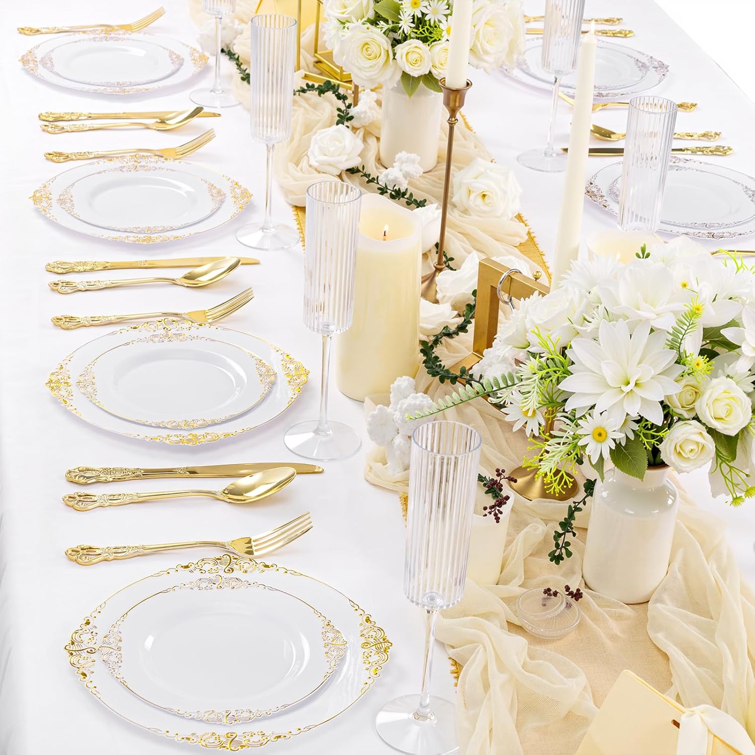 • Timeless Elegance: Immerse your events in an aura of timeless elegance with our white and gold plastic plates. The combination of classic white and sophisticated gold trim creates a refined aesthetic which gives your guests a noble and romantic feeling. Our gold disposable plates are effortlessly elevates weddings, parties, and gatherings to a new level of sophistication.