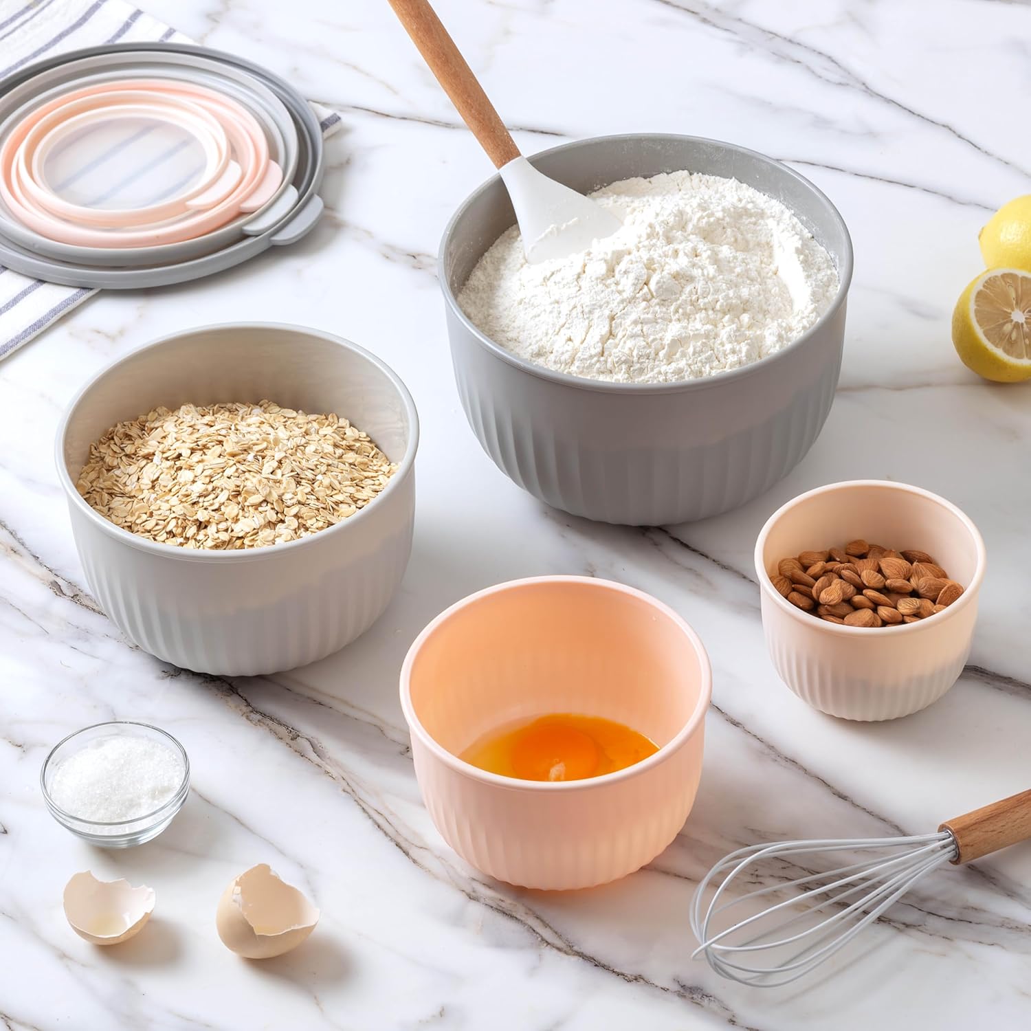COOK WITH COLOR Prep Bowls with Lids- Wide and Deep Nesting Plastic Small Mixing Bowl Set with Lids, 8 Piece Set - Deep Bowls, Grey/Pink