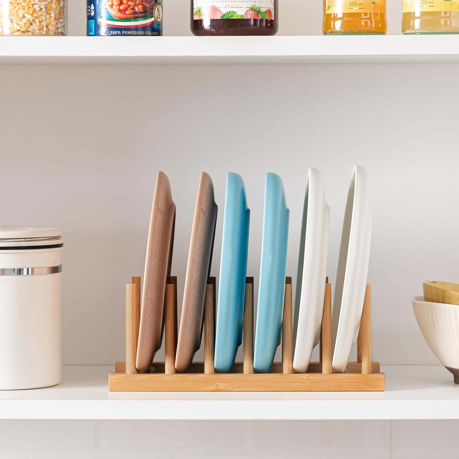 • The weight is light, the size is convenient for a compact kitchen, small counter space. Very Sturdy to hold 6 pcs dishes/ lids/ etc, and one plate/lids/etc per slot.good for cabinet divider.