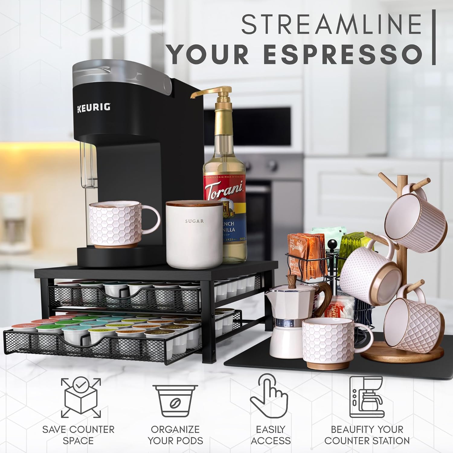 • INCLUDES REMOVABLE NON-SLIP MAT that secures your Kcup drawer and other coffee essentials from sliding or any potential mishaps. For a two-tiered coffee pod storage drawer, click 'ADD TO CART' now!