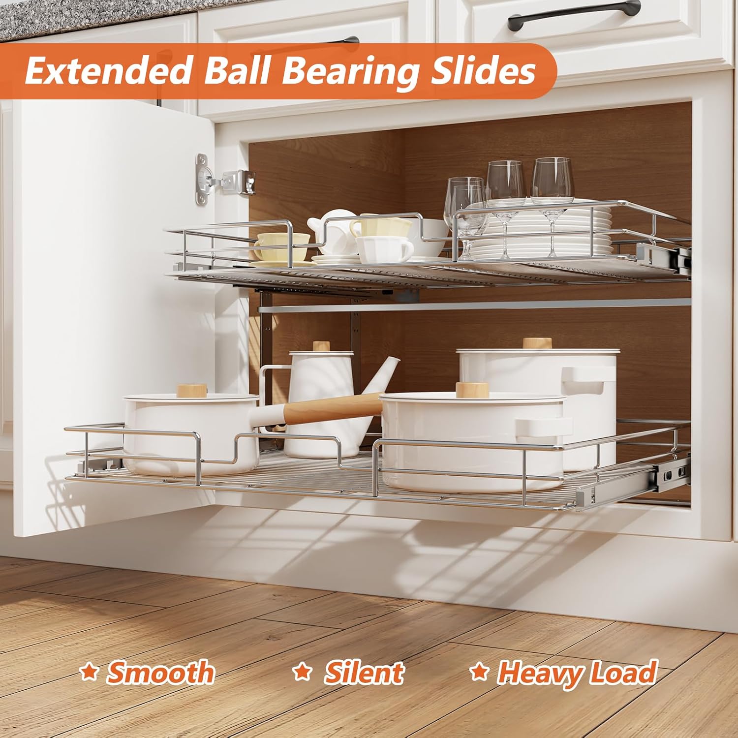• 【Space-saving Pull Out Cabinet Organizer】This slide out cabinet organizer can maximize your cabinet space. Makes it super easy to store, organize, and access your stand mixers, pots, pans, baking sheets and other kitchen accessories, cleaning supplies, and various odds and ends. Now your cabinet is no longer just stacks of potspans.