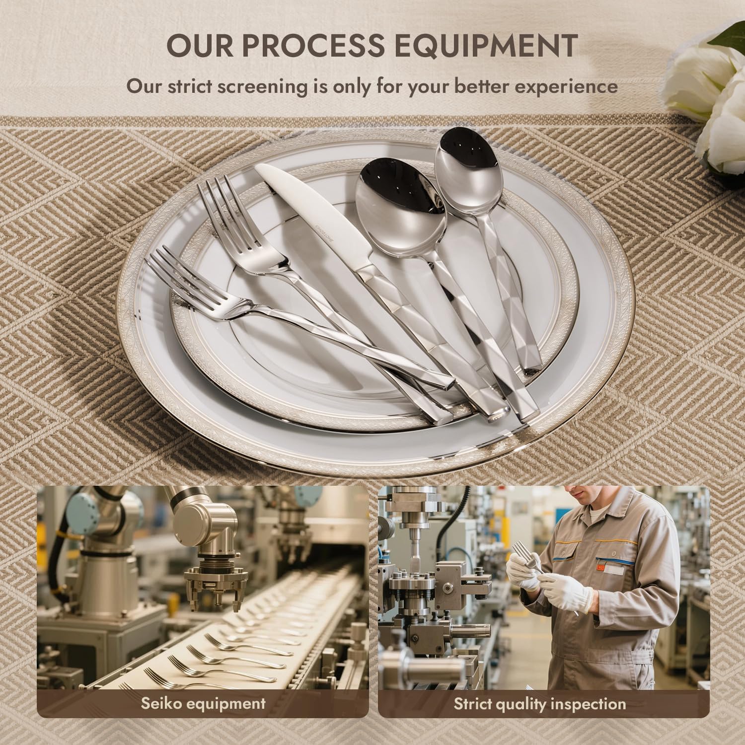 • TOP WORKMANSHIP:This tableware use more than 10 times handcraft polishing instead of machine polishing to make the surface like a mirror. High-temperature forging technology enhances the hardness of the material and will not bend or deform.