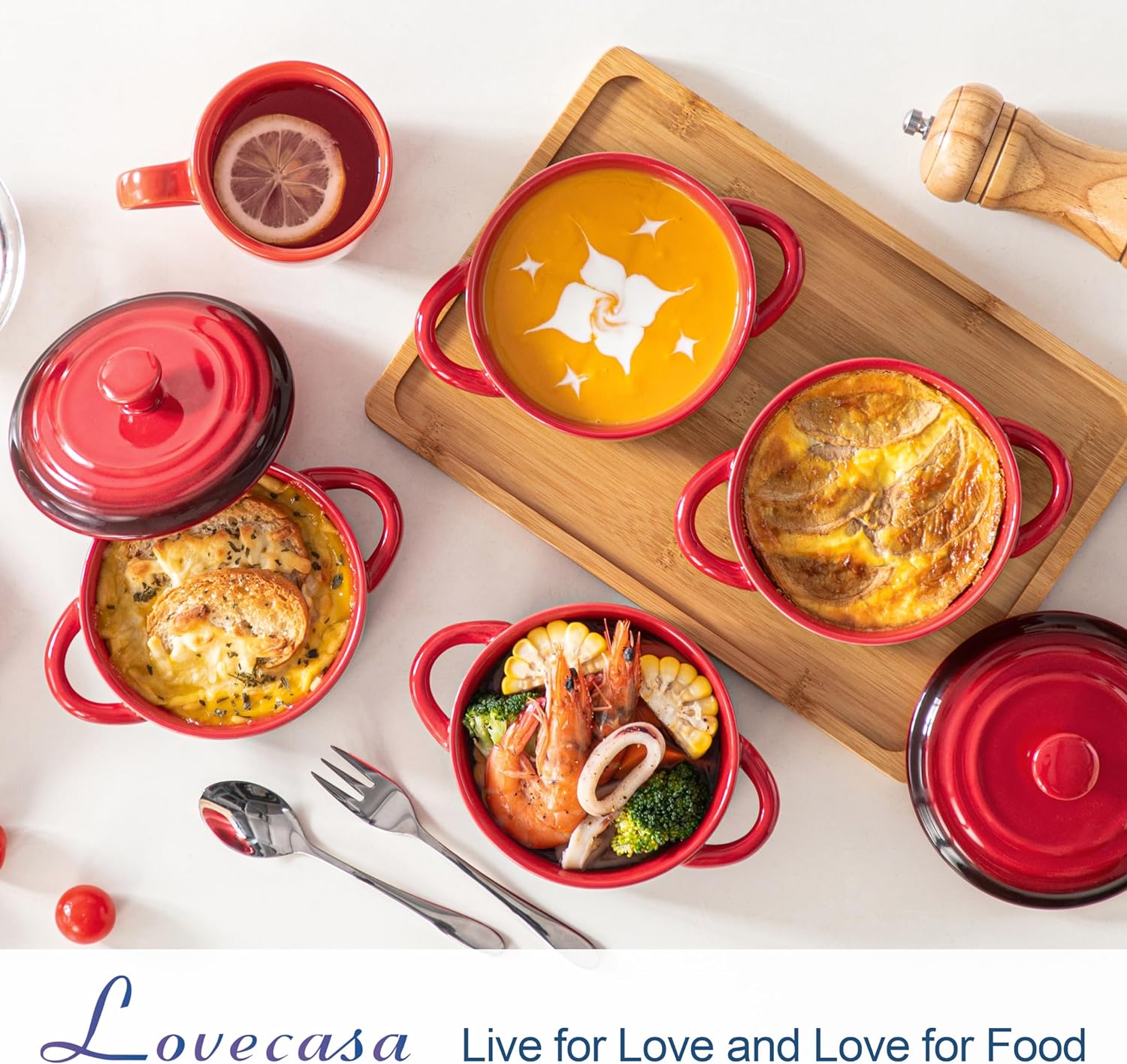 LOVECASA Mini Cocotte Set,12 OZ Small Casserole Dishes with Lids, Soup Bowls With Handles,Individual Baking Ramekins,Oven, Microwave & Dishwasher Safe,Set of 4,Red