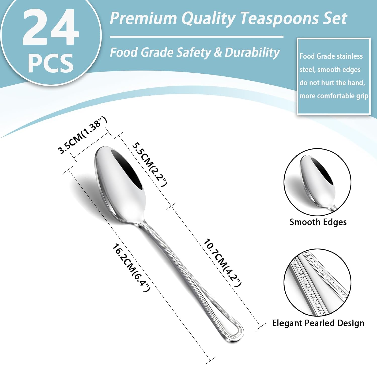 24 Pieces Teaspoons Set, 6.4 Inches Spoon Set, Stainless Steel Silverware, Small Spoons with Pearl Dot Design Handle, Dishwasher Safe, Tea Spoons Suitable for Home and Restaurant