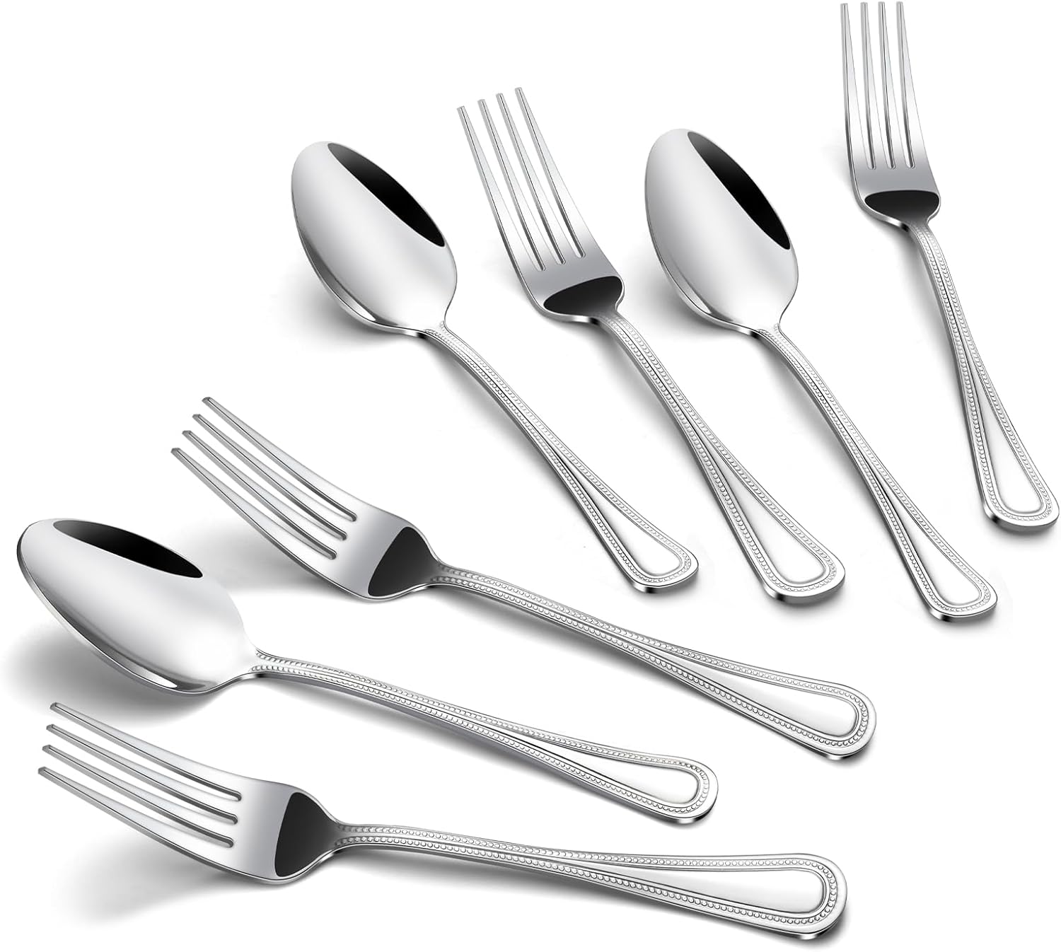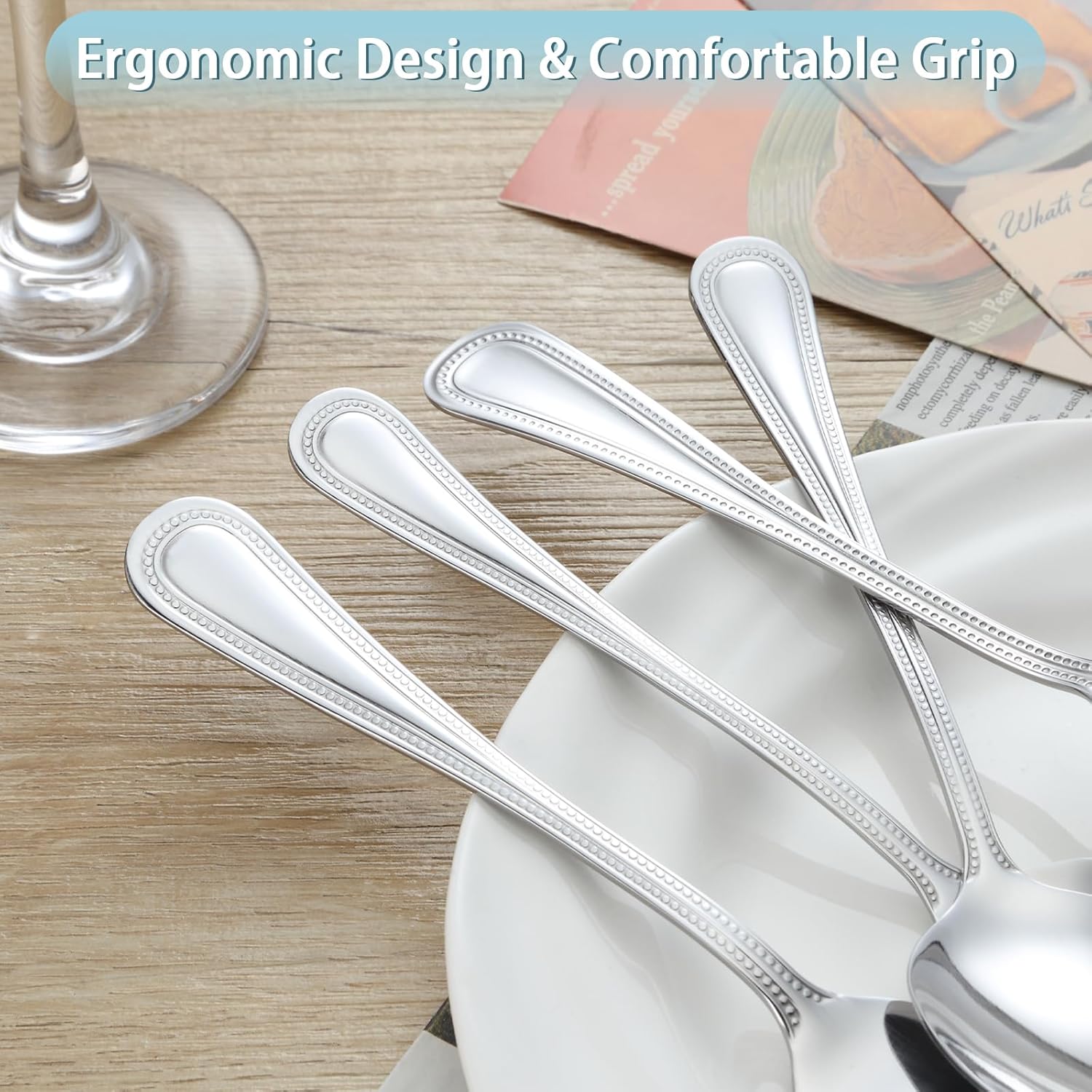 • Elegant Design: Unlike other flatware sets, the handles of the forks and spoons are designed with upgraded pearl dots, and the detail-filled three-dimensional pearl dot pattern is stylish and premium. Our spoons and forks set will add more class to your table and make you stand out in your table setting. In addition, the ergonomically designed silverware is well-balanced and the handles are rounded and smooth with no burrs, making them more comfortable to hold