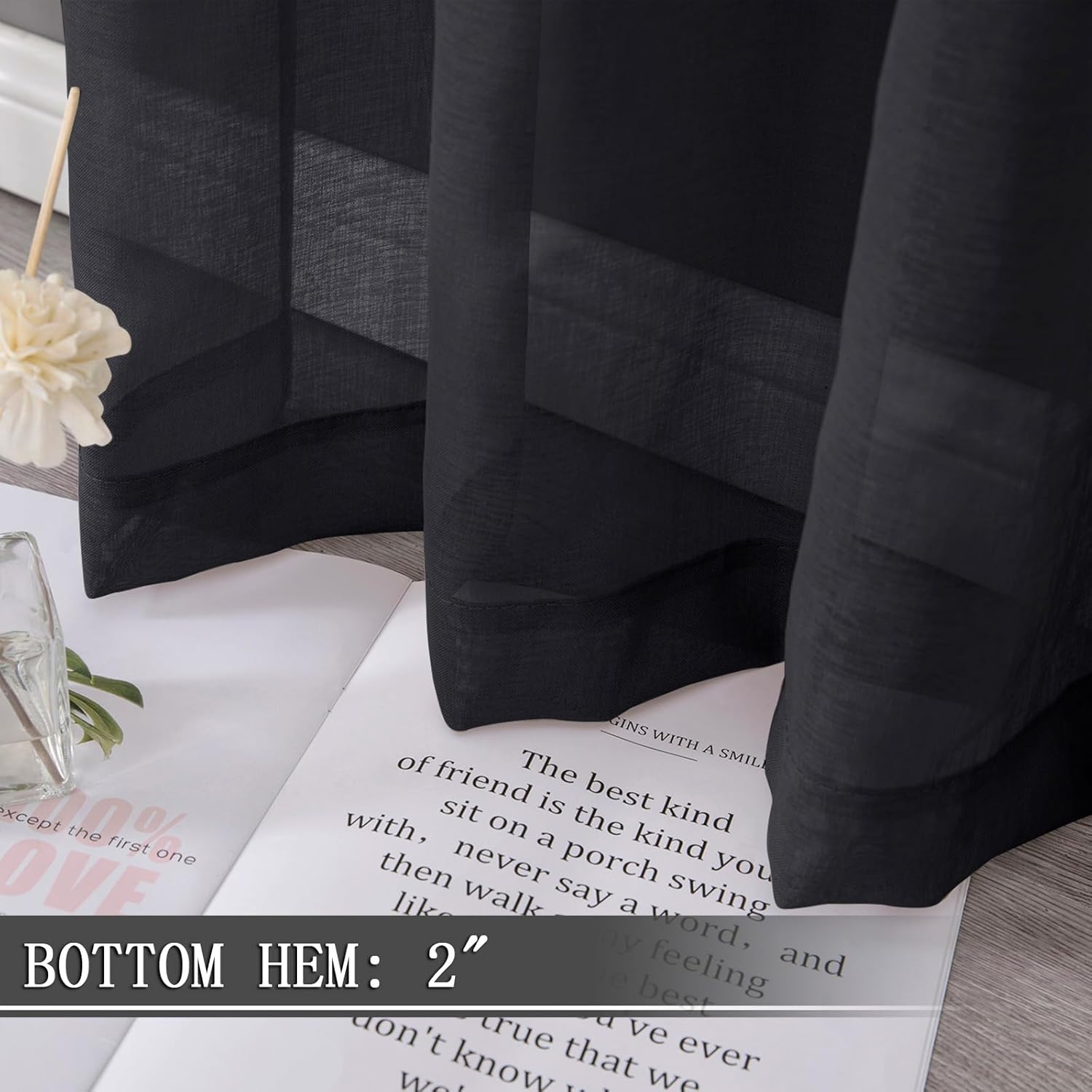 Tollpiz Sheer Curtains Living Room Linen Textured Curtain Sheers Light Filtering Voile Rod Pocket Curtains for Bedroom, 38 x 63 inches Long, Black, Set of 2 Panels