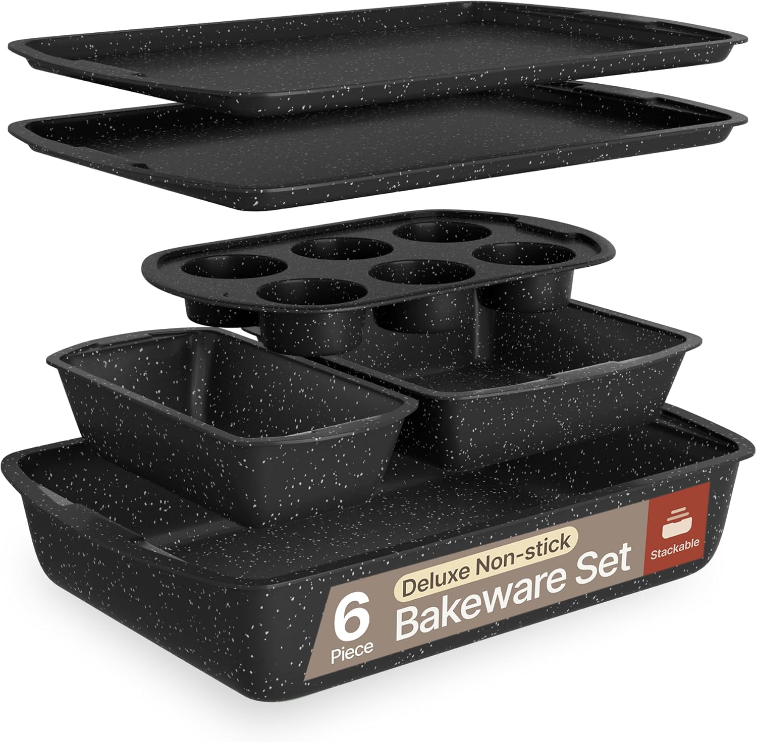 • UNLEASH YOUR CULINARY CREATIVITY - our 6-piece stackable bakeware set is designed to empower your home cooking with professional-grade tools. Create delicious baked goods regardless of your experience. Our set consists of 2x Cookie Sheets, 1x Roaster Pan, 1x Loaf Pan, 1x Muffin Pan and 1x Square Pan