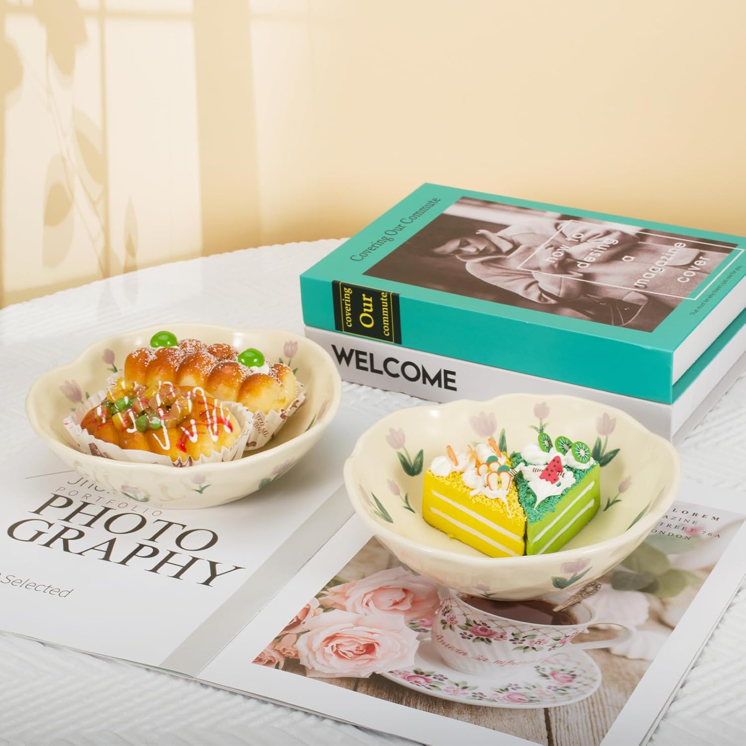 Koythin Salad Bowls Set of 2, Cute Purple Tulip Flower Ceramic Bowls, Cream Yellow Serving Bowl for Pasta, Cereal, Fruit, Soup, Rice, Dishwasher and Microwave Safe (Purple Tulip Set of 2)