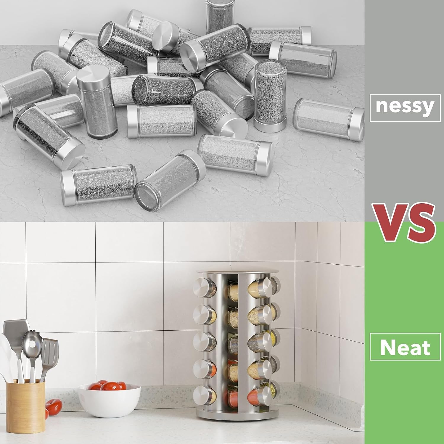 • COMPACT – Our spice rack has a narrow profile even though it holds 20 jars. It only measures 13.5"H x 7.5"W x 7.5"L. It’s a huge space saver and a great way to organize your spices inside your cabinet, shelf, pantry, or counter.