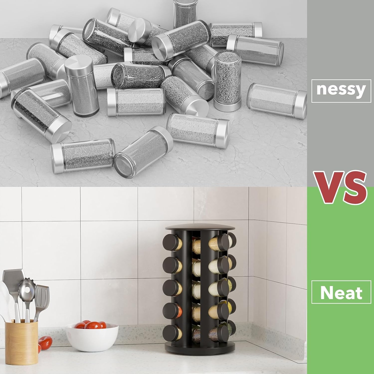 • COMPACT – Our spice rack has a narrow profile even though it holds 20 jars. It only measures 13.5"H x 7.5"W x 7.5"L. It’s a huge space saver and a great way to organize your spices inside your cabinet, shelf, pantry, or counter.