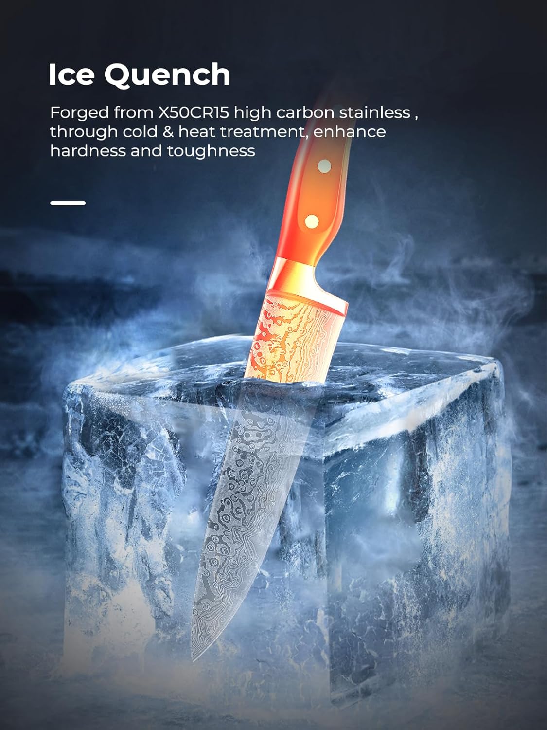 • Premium High Carbon Stainless Steel - The blade is made of X50CrMo15 high carbon stainless steel, possessing high hardness of 55±2 HRC (Rockwell Hardness Scale) and better toughness, perfectly balancing hardness and toughness. Each blade is heat-treated and hand-polished to 15 °on each side.With a sharp blade, precise cutting ensures that the food retains its shape and flavor, and tastes even better.
