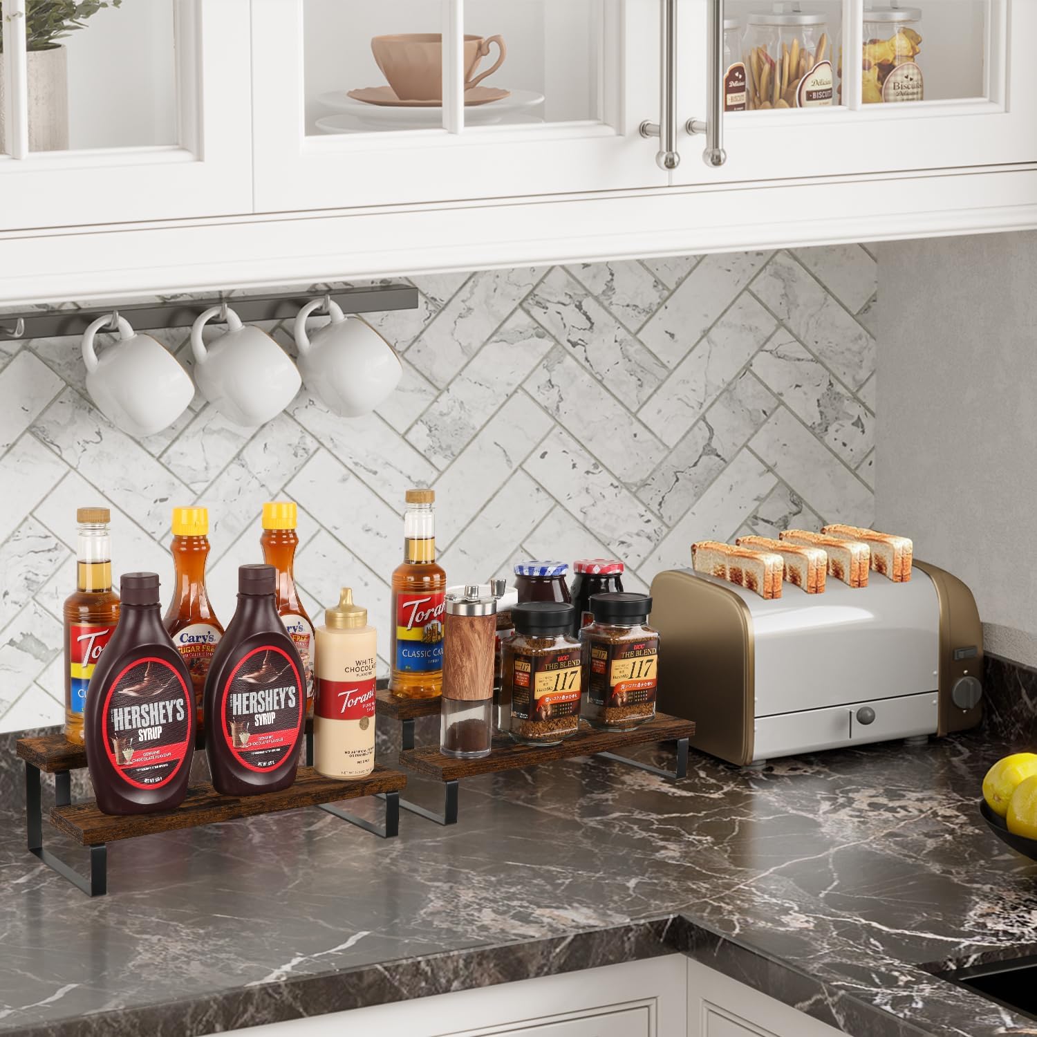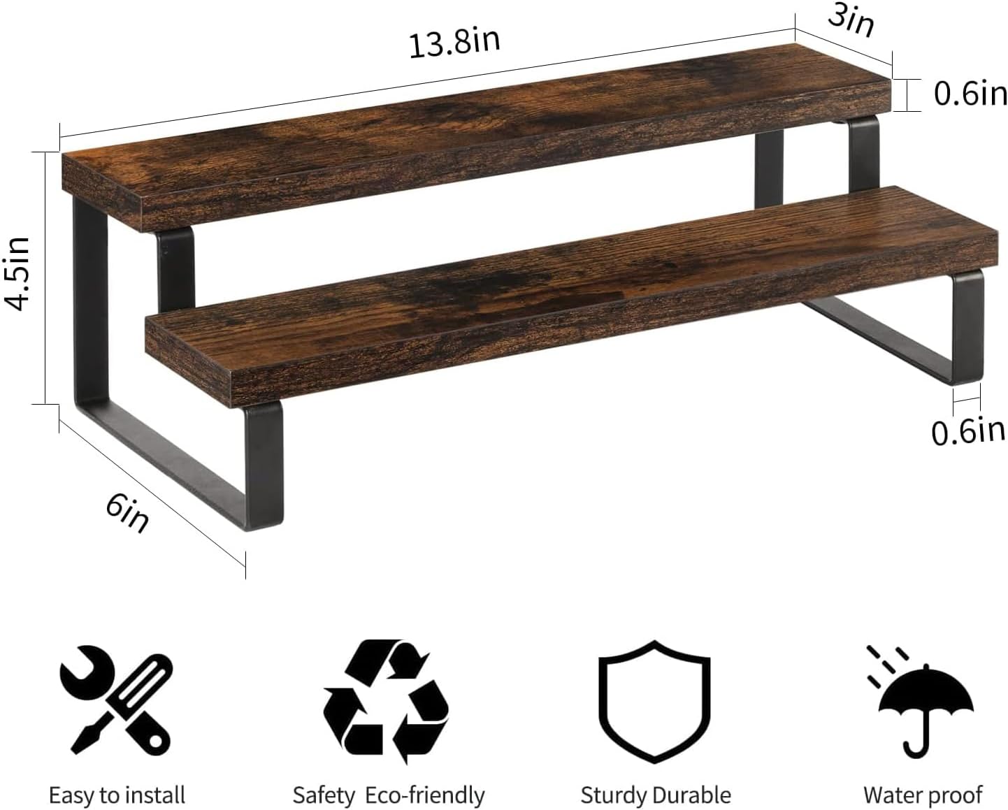 • Quick Setup & Easy Cleaning: You can have this 2-tier display riser stand assembled in 10 minutes with detailed instructions and tools. The wooden surface is waterproof and dust-free, a damp cloth could keep the counter shelf clean. (Assembly tools and accessories are included in the package)